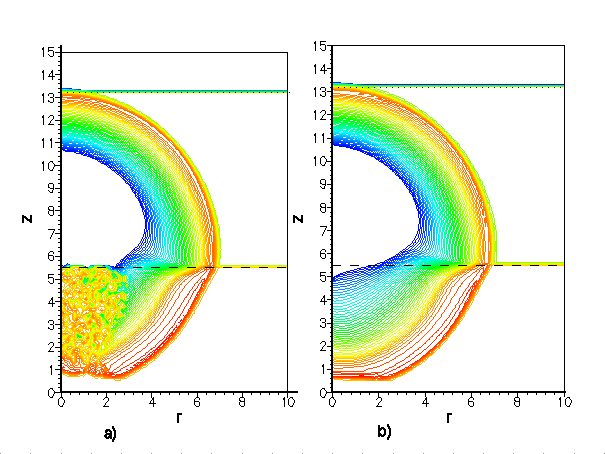 В качестве иллюстрации на рисунке (a) приводится визуализация промежуточных результатов вычислительного эксперимента, в котором была допущена незначительная логическая ошибка. В результате была потеряна монотонность решения, первоначально по одному параметру в локальной достаточно ограниченной части расчетной области, которая впоследствии существенно расширилась. При этом контроль вычислений по интегральным параметрам задачи оставался стабильным во все время расчета и не позволял сделать заключения о возможной ошибке. Оперативно проведенная процедура визуализации позволила - во-первых, установить факт наличие ошибки, а во-вторых, примерно определить характер и происхождение последней. Результаты вычислительного эксперимента проведенного после устранения ошибки приводятся на рисунке (в).